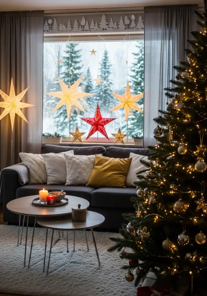 Layer star lanterns with a thin light garland along the sill. It doubles the shine of window Christmas lights in the living room.