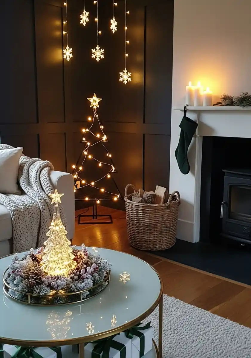 You know that one corner that never gets love. Give it a wire outline tree with simple bulbs. It looks like a sketch come to life. On the coffee table, place a small acrylic tree in a tray of frosted greenery. It acts like a lighthouse for snacks, remotes, everything.