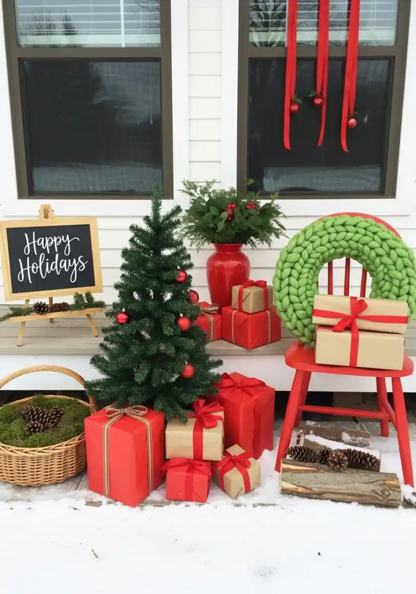 Here’s how I’d build it. Save your shipping boxes for a week, wrap them in kraft paper, and tie clean red bows. Put a mini tree in a basket or low planter for sturdiness. Use a chair as a wreath stand so you don’t have to drill into siding. Add a basket with moss and pinecones for texture. Bonus hack. Tie three ribbons to the top of a window and hang ornament bells at the ends. It gives height without another big buy. This layout also checks off a bunch of holiday patio decor ideas in one go and it’s friendly for renters.