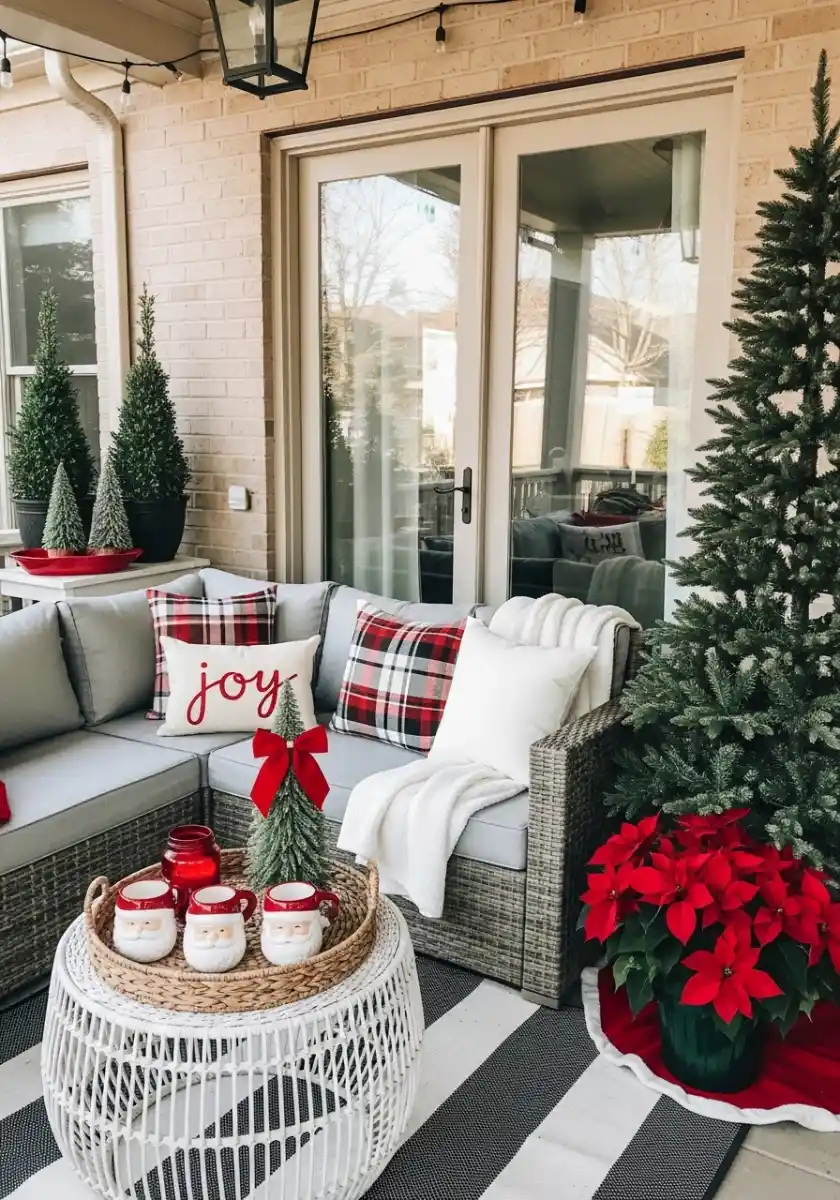 Copy it by treating the layout like a hallway. Group the seating by the house wall, then put trees and the pouf opposite to keep the walkway open. Use one patterned pillow only. Buffalo check does the job and keeps the vibe classic. Stack folded floor cushions at the entry for extra seating during cocoa night. These are clean, renter-friendly Christmas porch décor ideas, and they’re perfect if you need small porch Christmas ideas you can set up in under an afternoon. I’d call it a great add to your list of christmas patio decorating ideas for tight spaces.