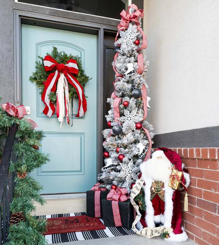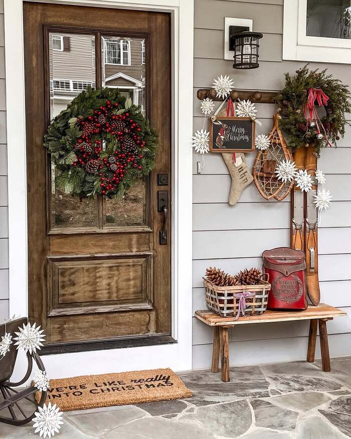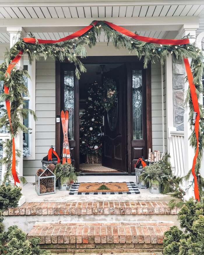This entry keeps it breezy with long pine boughs draped along the frame and simple red ribbon streamers. Vintage skis lean on both sides and point the eye toward the tree you can see inside. That peek inside matters more than we think. It pulls guests forward. If you’ve got a tree in the foyer, leave the door ajar during parties so the lights connect the indoor and holiday porch decor outside.