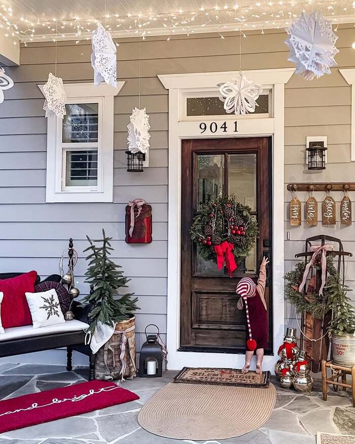 Here’s my hack. Cut the snowflakes from stiff white paper and spray them with a light coat of clear sealer so they handle damp air. Use small command hooks under the soffit to hang them. Add a vintage sled or wooden skis by the door for height. Even a single child-size tree in a basket warms the scene. This is porch Christmas decor that kids notice. Magic without glitter shedding everywhere.
