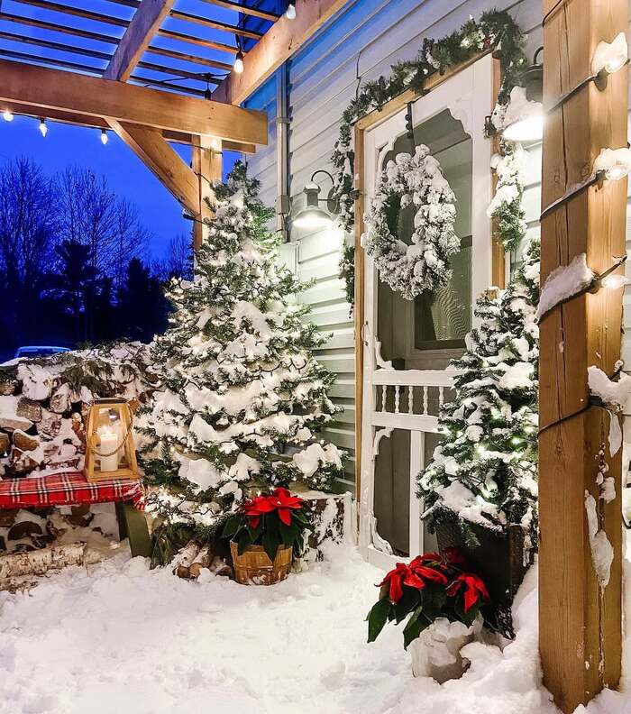 This scene basically screams holiday movie. Two stout trees flank a screen door, and everything is coated with real snow. The secret to this kind of Christmas front porch is weight. Use heavy planters or concrete blocks inside the pots so the trees don’t tip in wind. I also shove bricks into the bottom of urns. Tuck logs or tree stumps around the bases to look rustic and to hide cords.