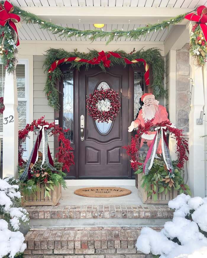 As front porch Christmas decorations go, berries give instant texture without adding 50 more ornaments. I like berry picks on the outside edges of the garland to widen the silhouette and make the door look taller. Tuck a vintage Santa cutout or a wood sign on one side so it feels like a friendly greeter. That asymmetry is cozy, not messy. This is premium christmas porch decor minus premium stress.