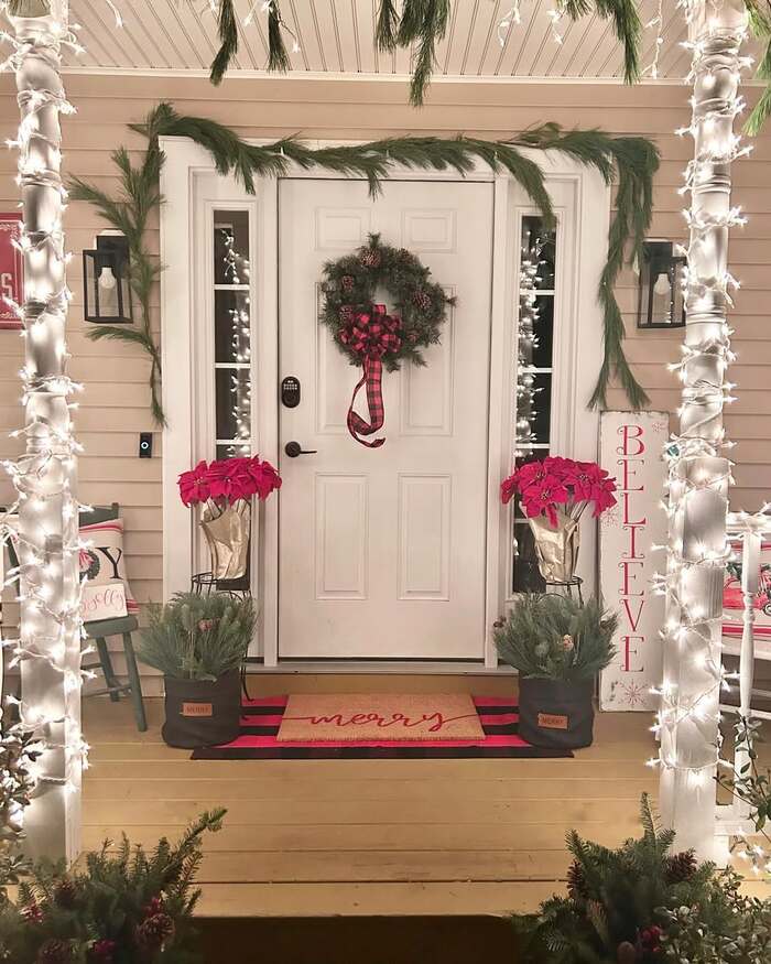 This is the no-fail plan for renters or minimalists. White door, classic wreath with plaid tails, two poinsettias standing like toy soldiers, and icicle lights framing the porch. I used to scatter small things everywhere, but the paired planters trick makes the porch look intentional. Use tall, skinny pots so they don’t block the walkway. Add fresh soil bags inside the pots to weigh them down against wind, then slip the plant sleeves in on top.