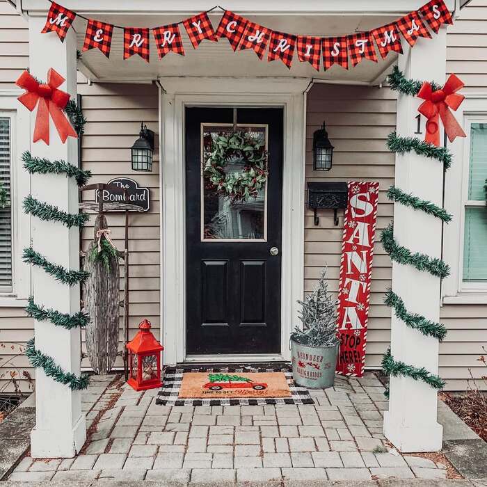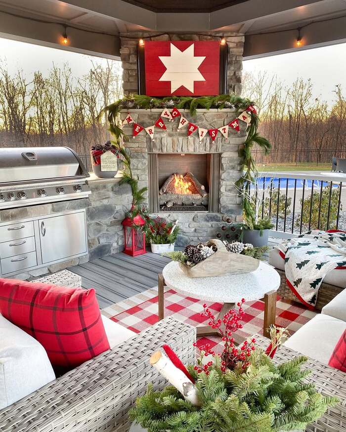 This covered patio reads like a cabin lounge, complete with a fireplace and plaid rugs. It’s smart holiday porch decor for anyone who hosts outside. The garland runs wide across the mantle and then falls in loose tails that look relaxed, not stiff. If you don’t have a mantle, copy the idea with a garland swag across a railing or pergola beam, then let the ends drop toward the floor. The banner says Merry Christmas, but any fabric bunting works.