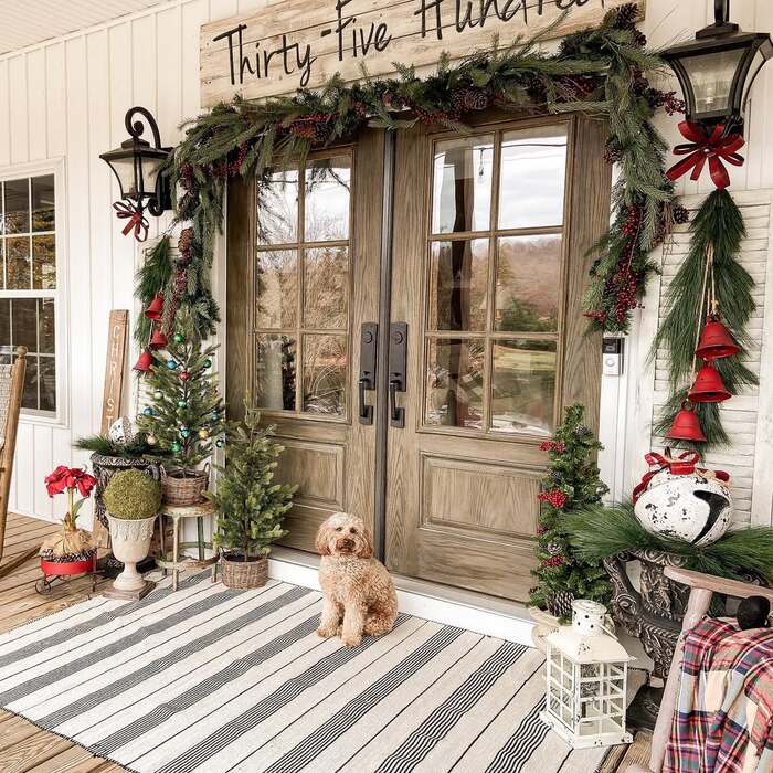Layered rugs are the unsung hero in festive porch decorations. A big stripey area rug under the doormat softens the wood decking and says “cozy” before you even knock. Mix planters in different materials, like urns, baskets, and crocks, but keep the greenery similar. That way it’s collected not cluttered. This setup is serious christmas porch decor with farmhouse soul and dog-approved floor space.