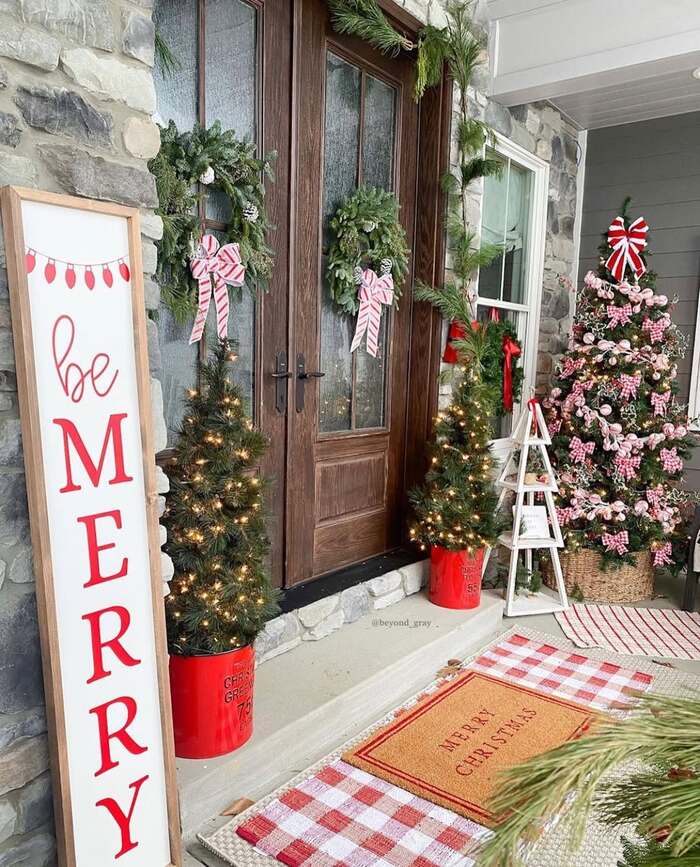 These next doors rock twin wreaths with pink candy-striped bows, matching mini trees in vintage red buckets, and a giant “Be Merry” sign. If you ever feel shy about pink outside, this is proof it works. The trick is pairing it with deep green and wood so it doesn’t go all bubblegum. Put the tall sign on the side that has more open wall space so it doesn’t crowd the door swing.