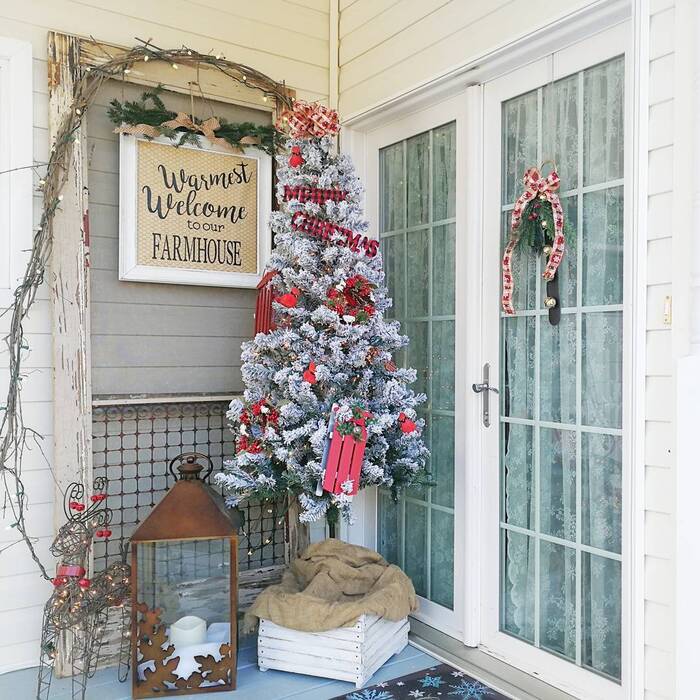 For outdoor Christmas decor that survives wind, hide sandbags inside that crate and under the burlap. Tie ornaments to the tree with twine instead of hooks so they don’t fly off. Use one pop color, like the little red sled, to draw attention. A framed sign above seals the story. When guests arrive, they drift to this spot first. That’s when you know your christmas porch decor is doing its job.