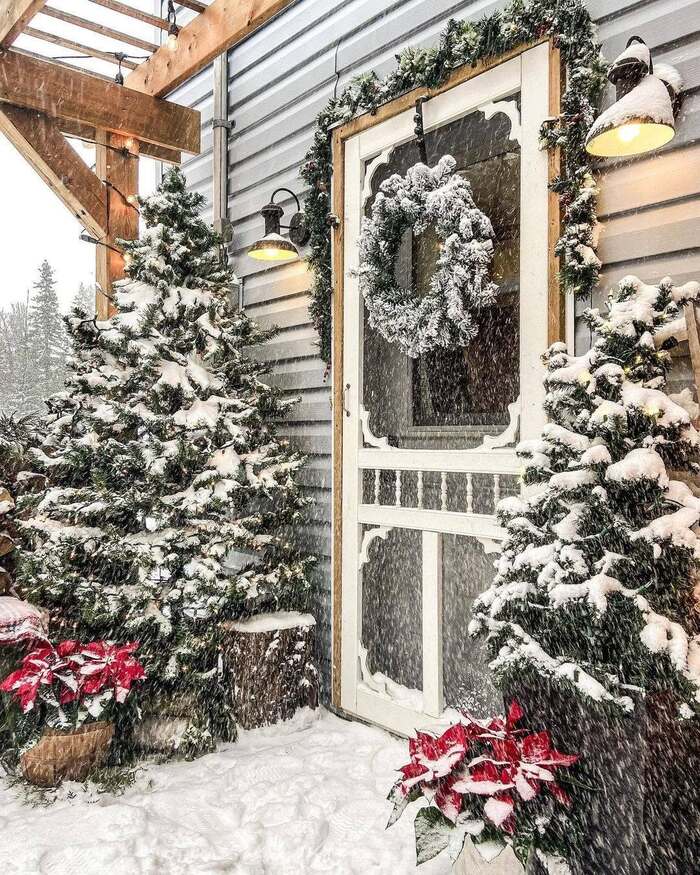 For copy-worthy christmas porch decor, copy the floor plan too. Place dark green planters or baskets to ground that snowy palette, then add two short stacks of split firewood or birch logs near a lantern. Poinsettias in rustic crates add that tiny punch of red everyone notices. Bonus hack: keep a small hand broom in a basket by the door. Brush off heavy snow from branches before it melts and refreezes, which can weigh them down.