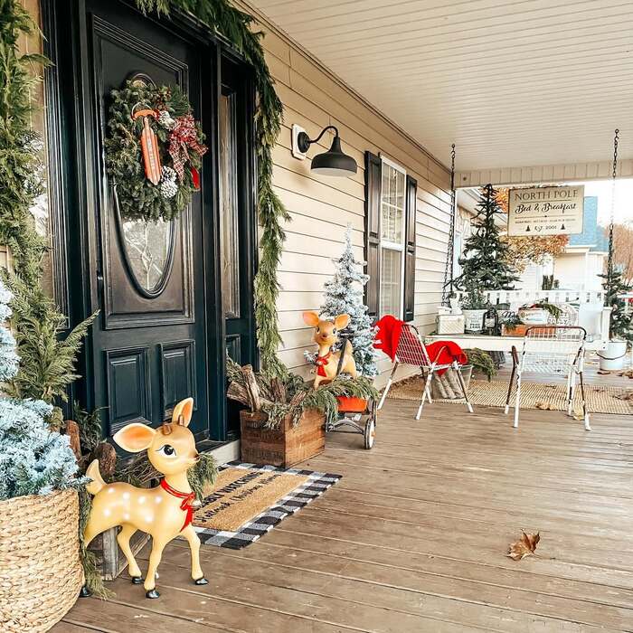 Nostalgic porch with deer figures and vintage touches
