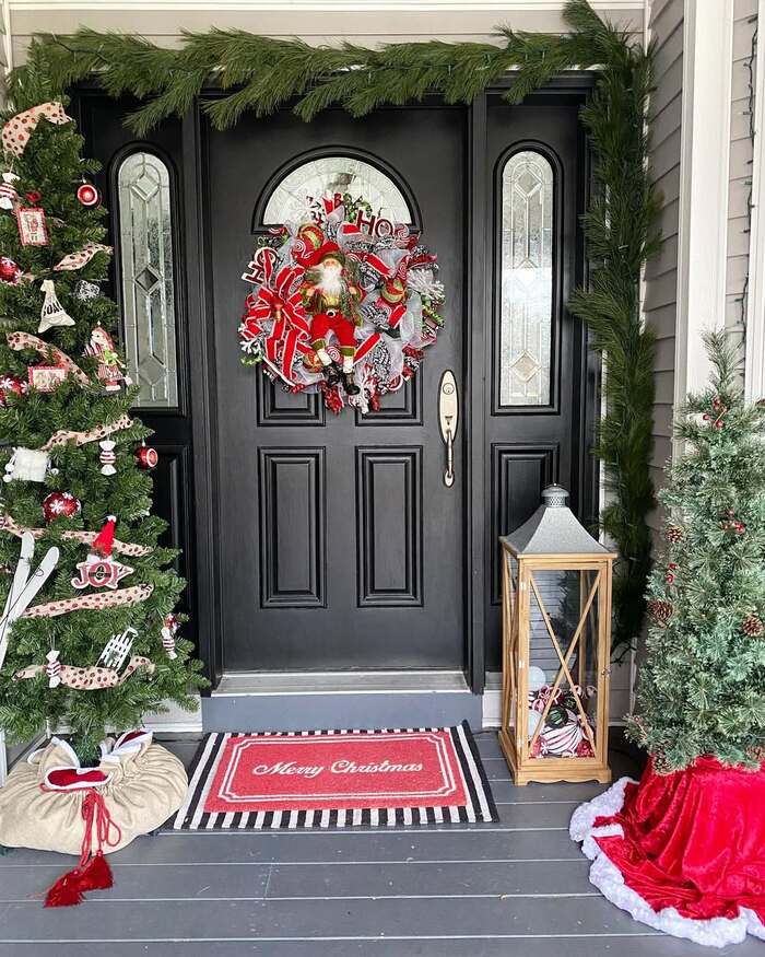 Layered doormats are the unsung hero of front porch Christmas decor. A striped rug under a coir mat makes the entry feel bigger and adds pattern without clutter. I learned this the hard way after using only a small mat that looked lost. Choose a low-pile outdoor rug so the door still swings freely. Add one lantern for glow and keep the rest cleared. It’s candy-cane themed but not chaotic, which my brain appreciates in December.