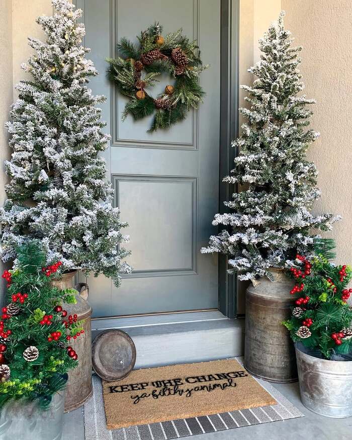 Two frosty trees sit inside old galvanized milk cans, berries pop from metal tubs, and the wreath is pinecone-heavy. The whole setup says calm winter rather than loud December. If you love porch holiday decor that works from November through January, this is your lane. Hunt thrift stores for cans and buckets, or fake it with plastic trash bins wrapped in burlap. Place bricks inside to weigh them down.