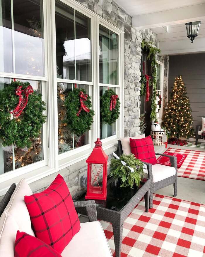 Seating makes the space usable. Simple gray chairs with plaid pillows and layered rugs feel friendly. Keep furniture pulled off the wall a bit so the wreaths are still visible from the street. Battery fairy lights inside the window wreaths keep cords out of sight. This is porch holiday decorating for people who like neat lines and not a lot of clutter. Clean, classic, and easy to maintain through the season.