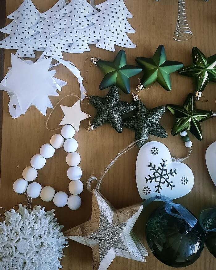 This flat-lay of ornaments gave me a secret sigh of relief. White paper trees with tiny stars, matte and glittery green stars, a wooden bead triangle, snowflakes, and a simple jute string. It’s a kit that already knows its color story. If your brain gets loud at craft stores, this tidy palette saves you. The green feels foresty and calm, the whites are fresh, and the wooden textures keep it cozy. I love the little heart with the snowflake because it adds curve next to all those points.