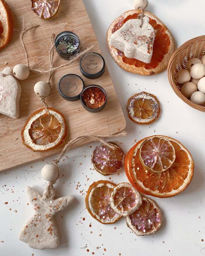 I used to roll my eyes at dried oranges. Then I made them, and now I’m obsessed. The slices glow like stained glass when the lights hit. Mix them with little salt-dough shapes sprinkled in eco glitter and you get sparkle without plastic guilt. The color sits in the warm zone which flatters almost every palette, especially green trees and neutral rooms.