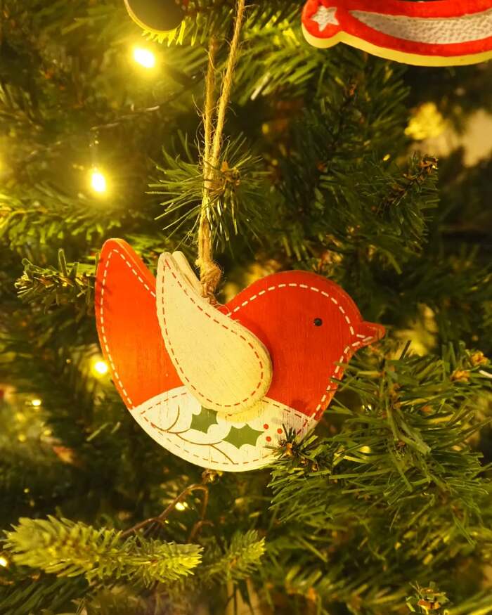 The red wooden bird with stitched painted details hits my heart. It’s cheerful and folk-y and not fussy. Wood ornaments sit beautifully against evergreen because the textures talk to each other. Plus they don’t shatter when someone bumps the tree during a dance party. I see you, nieces.