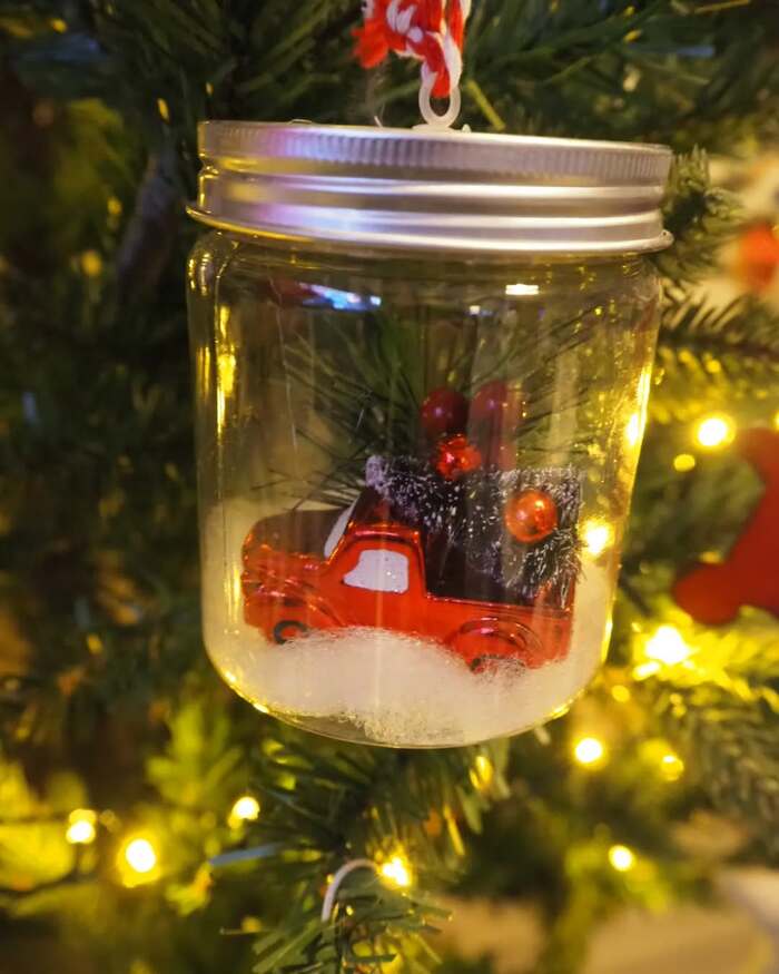 DIY steps. Spoon a little faux snow or white glitter into a clean jar. Glue a bottle-brush tree and a tiny car to the lid. Add two red berries and a snip of cedar for color. Screw the jar on and tie a ribbon through the lid ring. When you hang these christmas tree decorations, place them on sturdier branches midway down the tree so they feel anchored. If you make three, hang them in a triangle. It photographs adorable and gives your tree real storybook vibes.