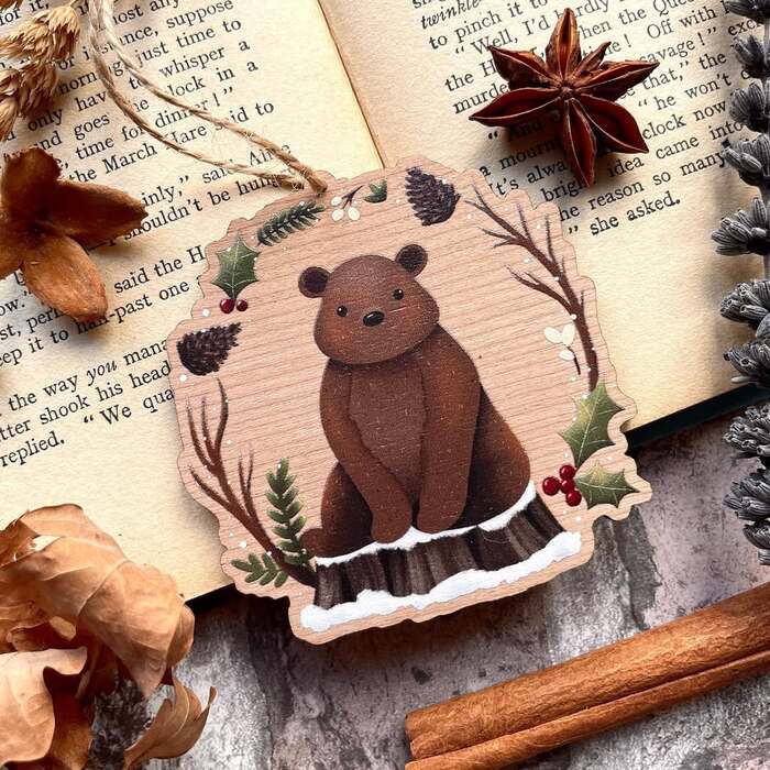 DIY time. Lightly sand a wood slice, brush on a thin coat of matte acrylic, then sketch your bear with a soft pencil. Paint in simple shapes, not details. Two ear circles, a round snout, and dot eyes. Add holly leaves and a snow ridge. Seal with matte Mod Podge so the piece lasts. When decorating the Christmas tree, cluster two or three wood-slice pieces at eye level to make a mini “gallery.” It’s one of my favorite Christmas tree ornament ideas that also doubles as a gift tag.