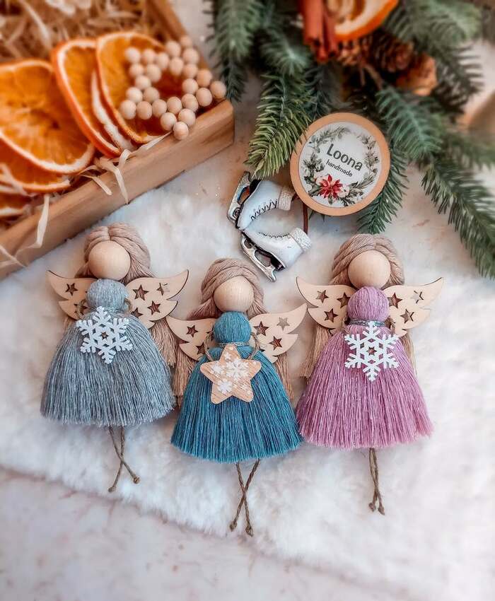 These tassel angels are the definition of adorable. Wood bead heads, star-cut wings, and fat floss skirts that sway when you walk by. They read childlike without feeling cheap. If you host kids, this is a crowd pleaser. I like that the color options are endless. Soft gray, teal, mauve, whatever matches your sofa blanket.