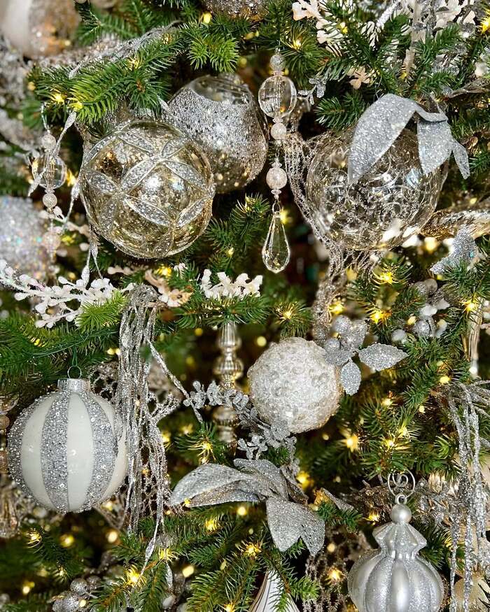 Sometimes you just want full sparkle. This close-up proves you can go 100 percent silver and still have depth. The secret is texture. Mesh ribbon, pearl-dotted balls, mirrored orbs, frosted leaves, and crystal drops all catch light differently. It’s like ice, but cozy. If your room has cool white walls or chrome fixtures, silver is the easiest Christmas tree decoration ideas lane.