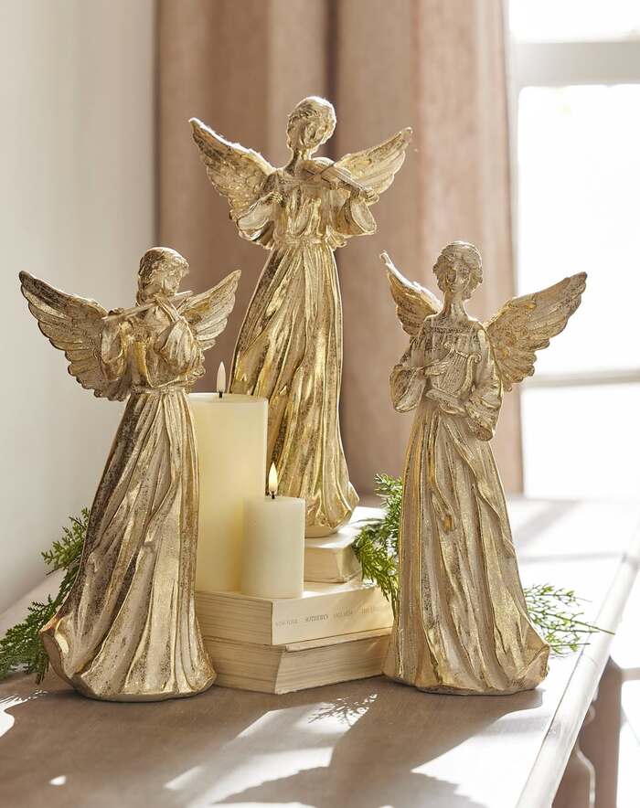 If you like warm glam, the gold angel trio is a total mood. The brushed finish is old world and the shapes are tall enough to anchor a console. I layer them on vintage books, then add chunky pillar candles and a few sprigs of greenery. The books lift them to different levels, which your eye loves. In the tree, pull that golden tone upward with champagne ornaments and leaf picks.