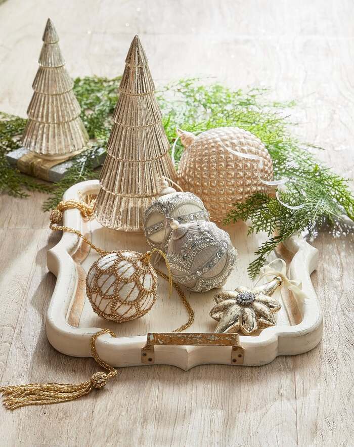 I like staging ornaments on a tray before they go on the tree. It feels intentional and it stops me from repeating the same bauble three times in a row. Pearl lattice balls, beaded globes, and a starburst look luxe but soft. Set them with two small tabletop trees on the tray and you’ve got a mini vignette for the coffee table while you work. It is also a sneaky way to limit your palette.
