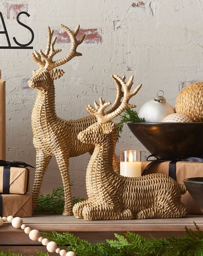 These rattan reindeer are the coziest little companions. Natural texture next to all that shine gives balance and makes the room feel real, not showroom. I’m team contrast. If your tree is full of glitter and glass, ground it with woven pieces. The standing and sitting pair create height changes and sort of frame the base without blocking the view of the ornaments. Plus they’re kid friendly and pet friendly.