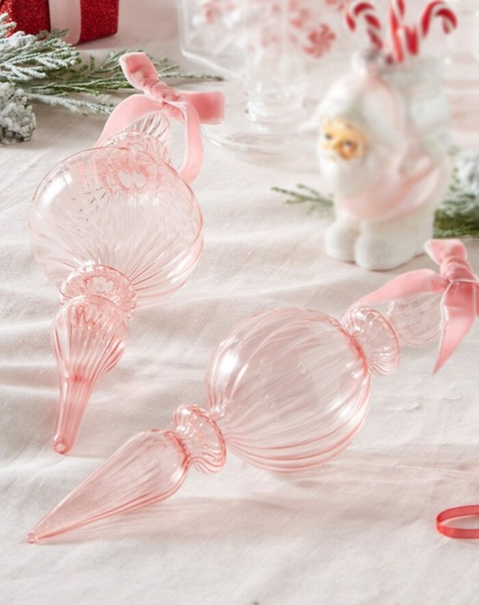 These blush pink glass finials are the exact kind of christmas tree decorations that make me whisper wow even when no one’s around. They’re airy, almost like spun sugar, and the ribbed glass throws light in soft stripes across the branches. I hang them high where the light is brightest and the branches are slimmer. Use three to five finials in a loose triangle so the eye keeps moving. The velvet bows are the secret sauce. I cut 18 inch pieces, tie a neat knot, then let the tails fall like ribbon rain. If you’re working with a flocked tree, these glass ornaments read like little icicles dipped in raspberry. Pair them with clear balls, pearl garlands, and one metallic like champagne so the palette stays calm.
