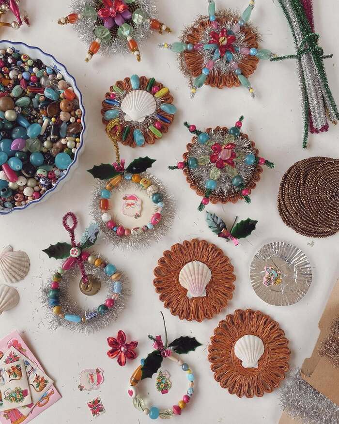 That flat lay with beads, shells, tinsel, and tiny stickers unlocked a memory. My aunt used to let us raid her craft box, and we made ornaments that were crooked and perfect. The charm here is color and nostalgia. Nothing too matchy, but still intentional. Choose a palette before you start. Turquoise, coral, gold, and a touch of red feels cheerful. Add silver tinsel rings to keep them festive.