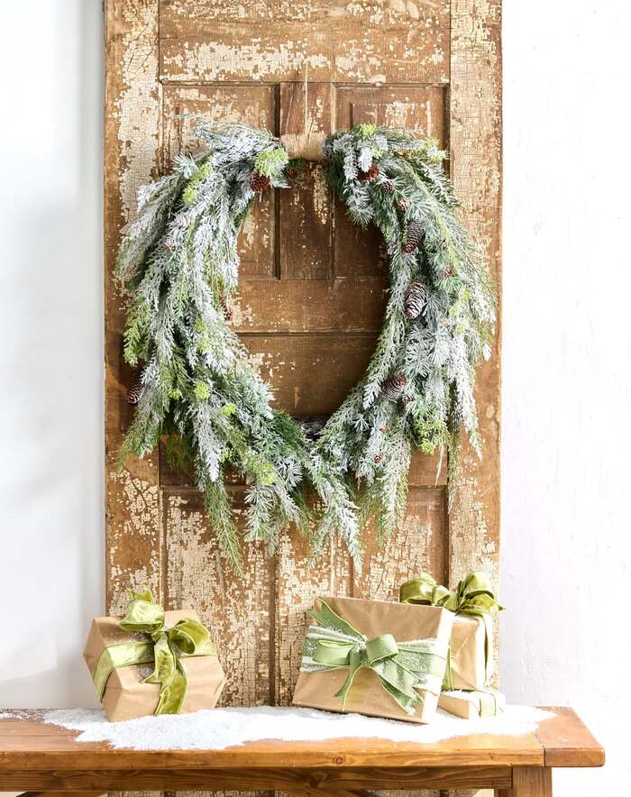 Bring that feeling into your Christmas tree decor by adding a few frosted cedar stems directly into the tree, letting them hang a bit past the natural silhouette. Keep the gift wrap simple, kraft paper with green velvet ribbons that match the wreath ties. Place a dusting of fake snow on the entry bench. Suddenly your home smells like pine and looks like a postcard. The best part, this decoration is light weight and stores flat, so you aren’t wrestling a giant wreath box in July.