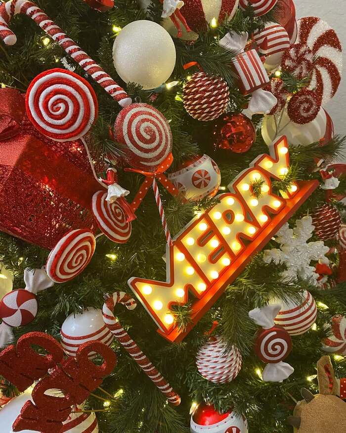 The marquee sign is the hero. Hang it slightly off center so the tree doesn’t feel stiff. Wire it to two branches for safety. Fill gaps with glitter ribbon in candy cane stripes. When you’re decorating the Christmas tree in this style, tinsel garland actually works again. Who knew. Add a red tree skirt with a white border so it echoes the candy circles. These christmas tree decorations are pure joy, and they photograph so cute for Christmas cards.