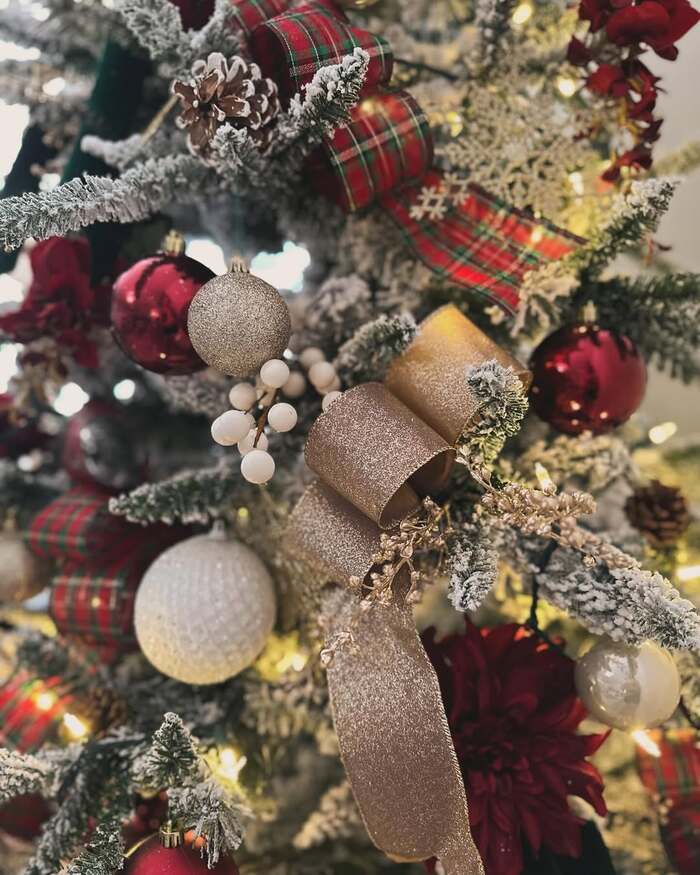 To style, run your tartan ribbon in long vertical drops. Anchor each drop deep, let it billow once, then tuck again. Add matte red ornaments and a handful of white textured ones for contrast. Sprinkle little pinecones to echo the frosted tips. This is a great base for heirlooms and family ornaments. Most tree decorating ideas need a workhorse scheme like this, because it welcomes the weird little crafts from school and still looks put together. Cozy, timeless, and easy to maintain.
