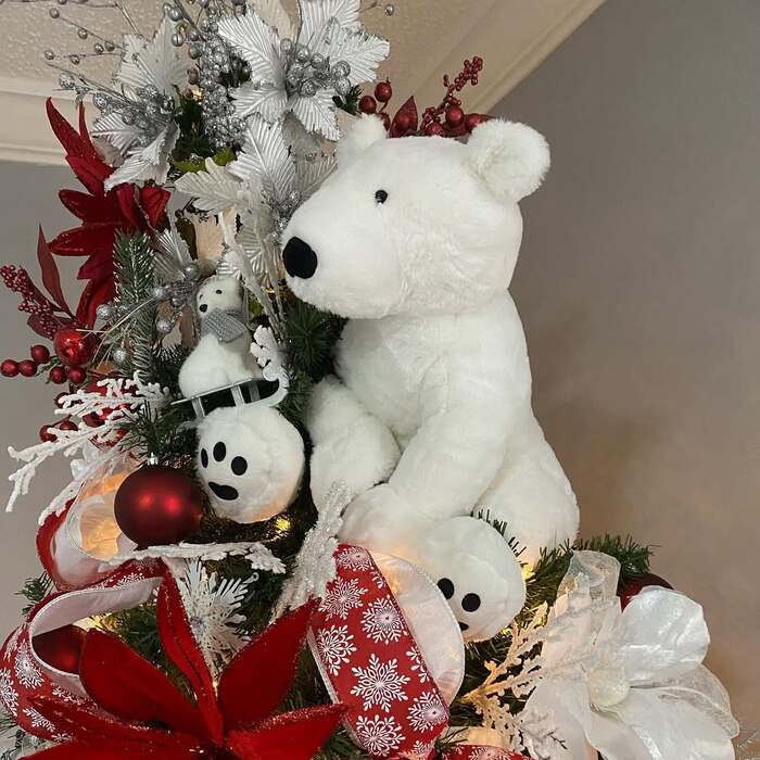 I laughed when I saw the plush polar bear perched at the top. It looks like he climbed the tree for snacks. Whimsy like this breaks the rules on purpose and makes kids glow. The trick is balance. Keep the rest of the tree tighter. Use red and white with a touch of silver, and repeat the bear shape once in a small ornament lower down so it feels connected. Mixed florals, berries, and snowball picks help the topper blend into the branches.