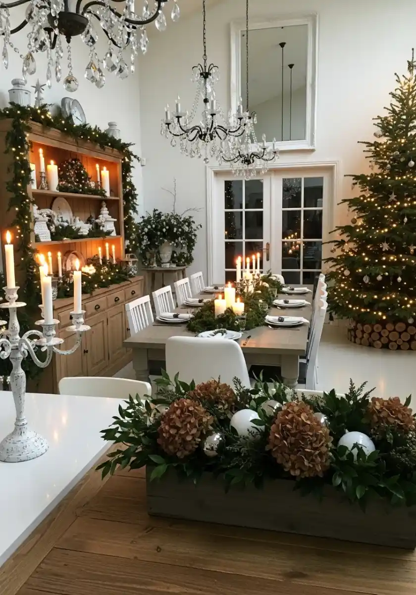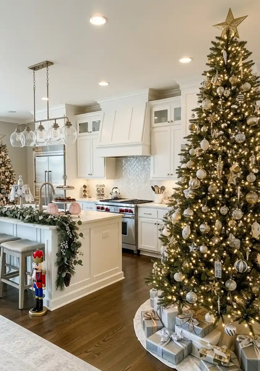 This image is technically the dining room, but it’s wide open to the kitchen, and the large tree plus chandeliers create a glow that spills back over the counters. Greenery garlands, white candles, and crystal drops say formal, yet the natural wood keeps it comfortable. It teaches restraint. The kitchen Christmas tree can be grand, but the tabletop should stay useful.