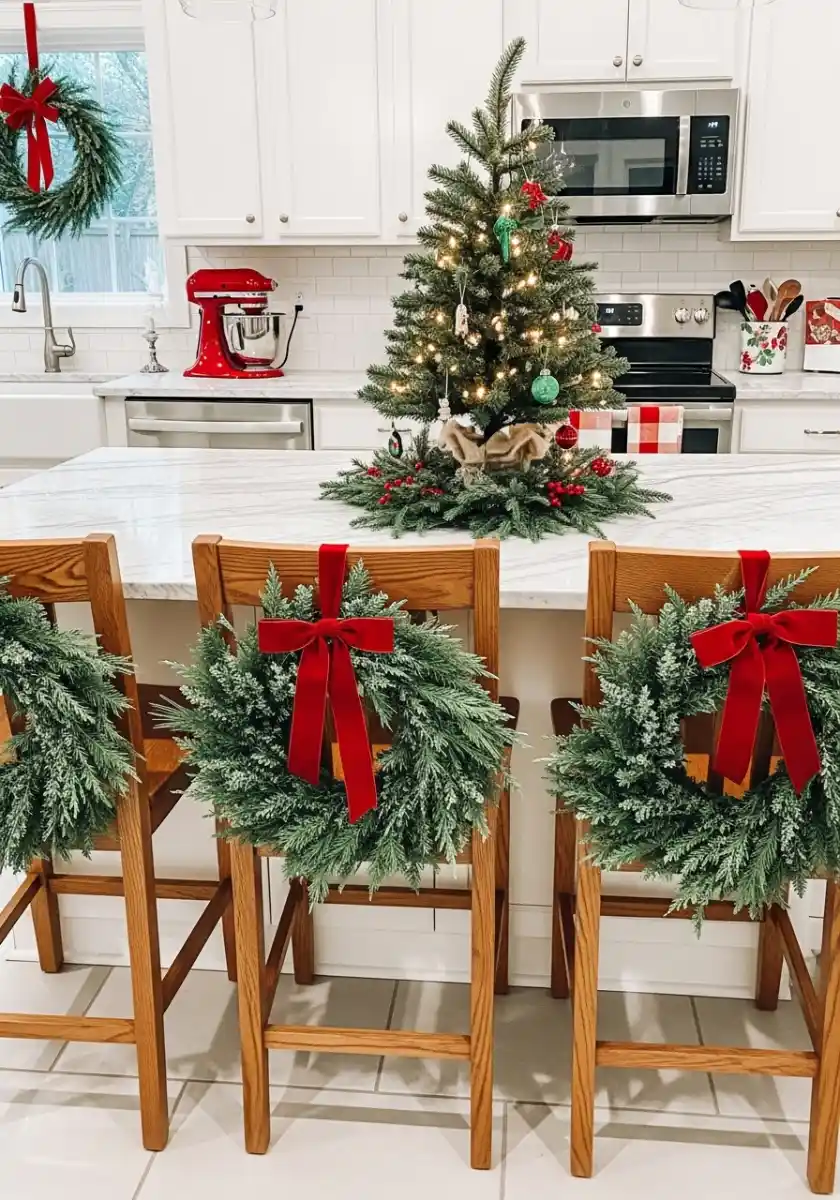 Next idea is crisp and cheerful: a mini christmas tree in kitchen right on the center island, surrounded by frosty greenery. I tucked red berries at the base and echoed the color with wreaths tied to the backs of bar stools using velvet ribbon. It sounds extra, but those chair wreaths make the whole kitchen feel like a little bistro at the North Pole.