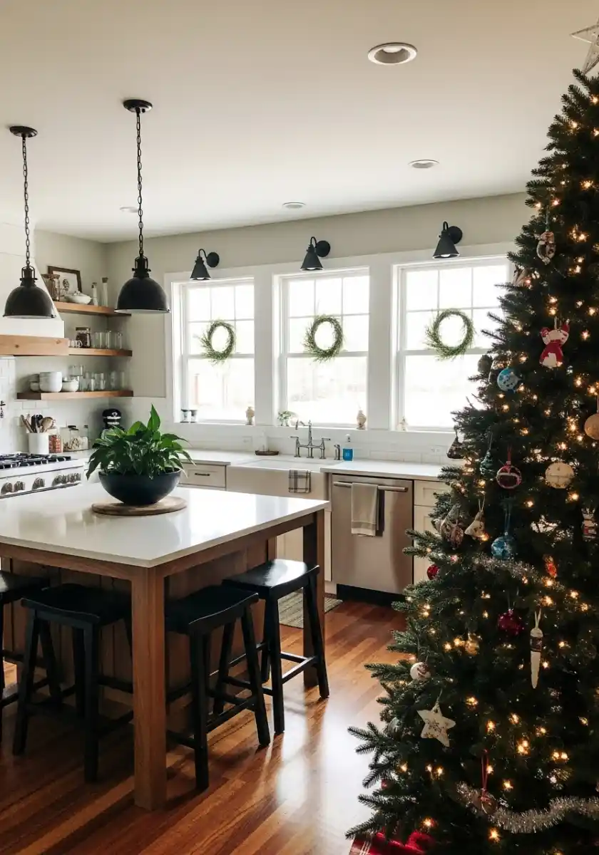 If you want this mood, echo the garland on your kitchen shelves and keep ornaments in a simple metallic palette. I like silver and matte white for a modern farmhouse vibe. Put a small herb pot on the island to tie back to the fresh greens at the table. You’ll get the romance of a christmas tree in the kitchen without crowding prep zones.