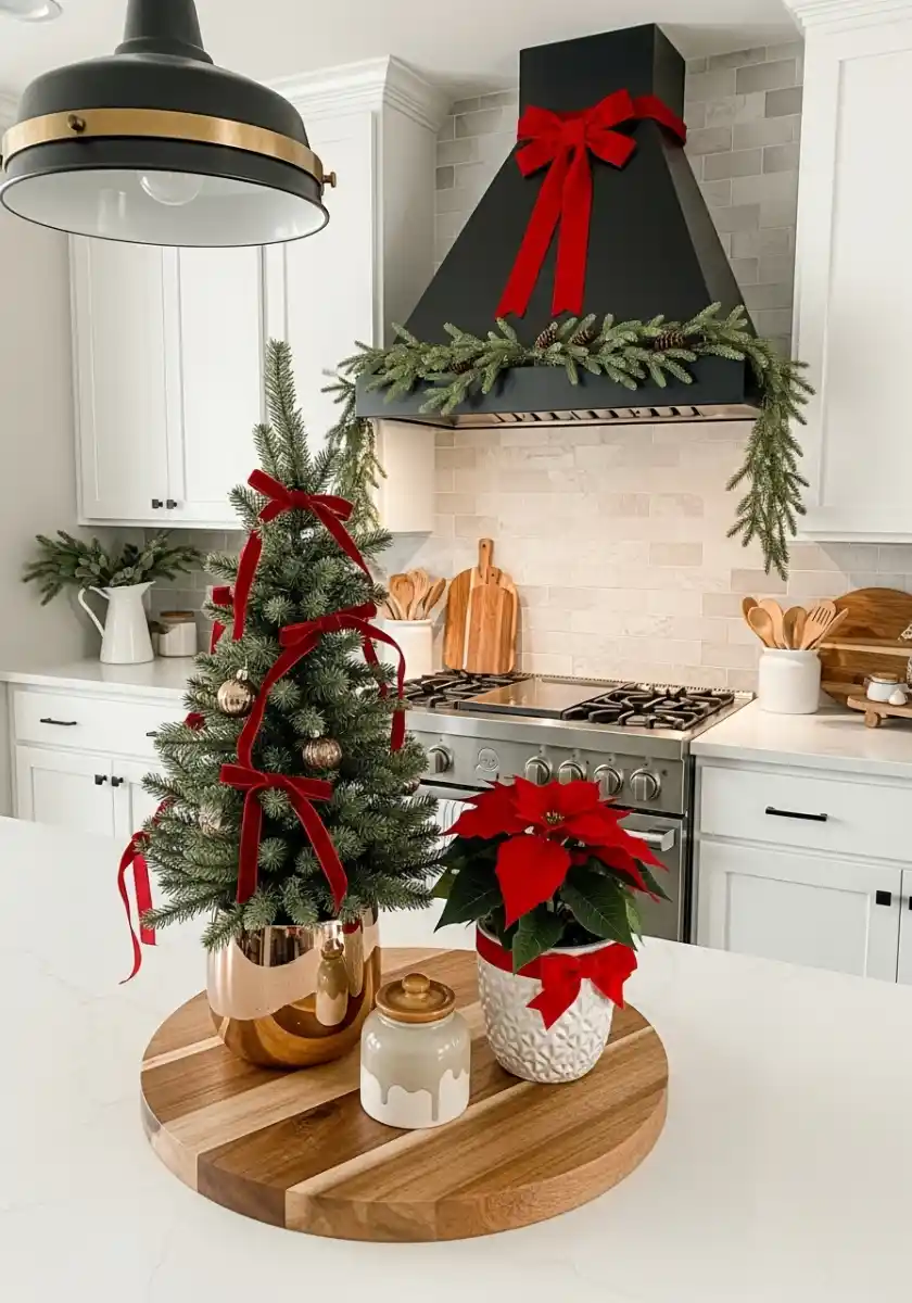 Black Range Hood, Red Bows, and a Countertop Tree