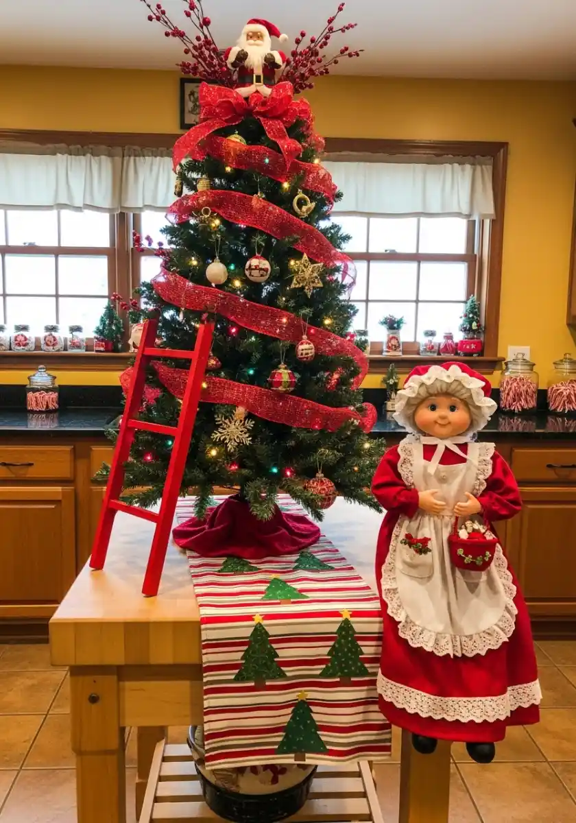 A whimsical christmas tree in kitchen perched on the island with vintage red accents makes me grin every time. I borrowed a friendly Mrs. Claus figure from my mom and paired it with a fun runner. The tree wears wide red ribbon and classic bulbs. It’s childlike, and yes, I’m the child.