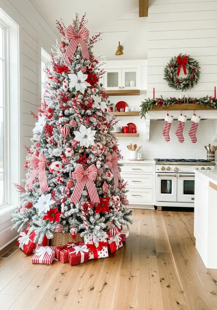 This one is bold, and I’m obsessed. A flocked kitchen Christmas tree overloaded with red and white ribbon, poinsettias, and peppermint ornaments sits near open shelves and stockings. It’s very candy shop, very joy. When I posted mine, my cousin texted “it looks like sugar.” I took that as a compliment.