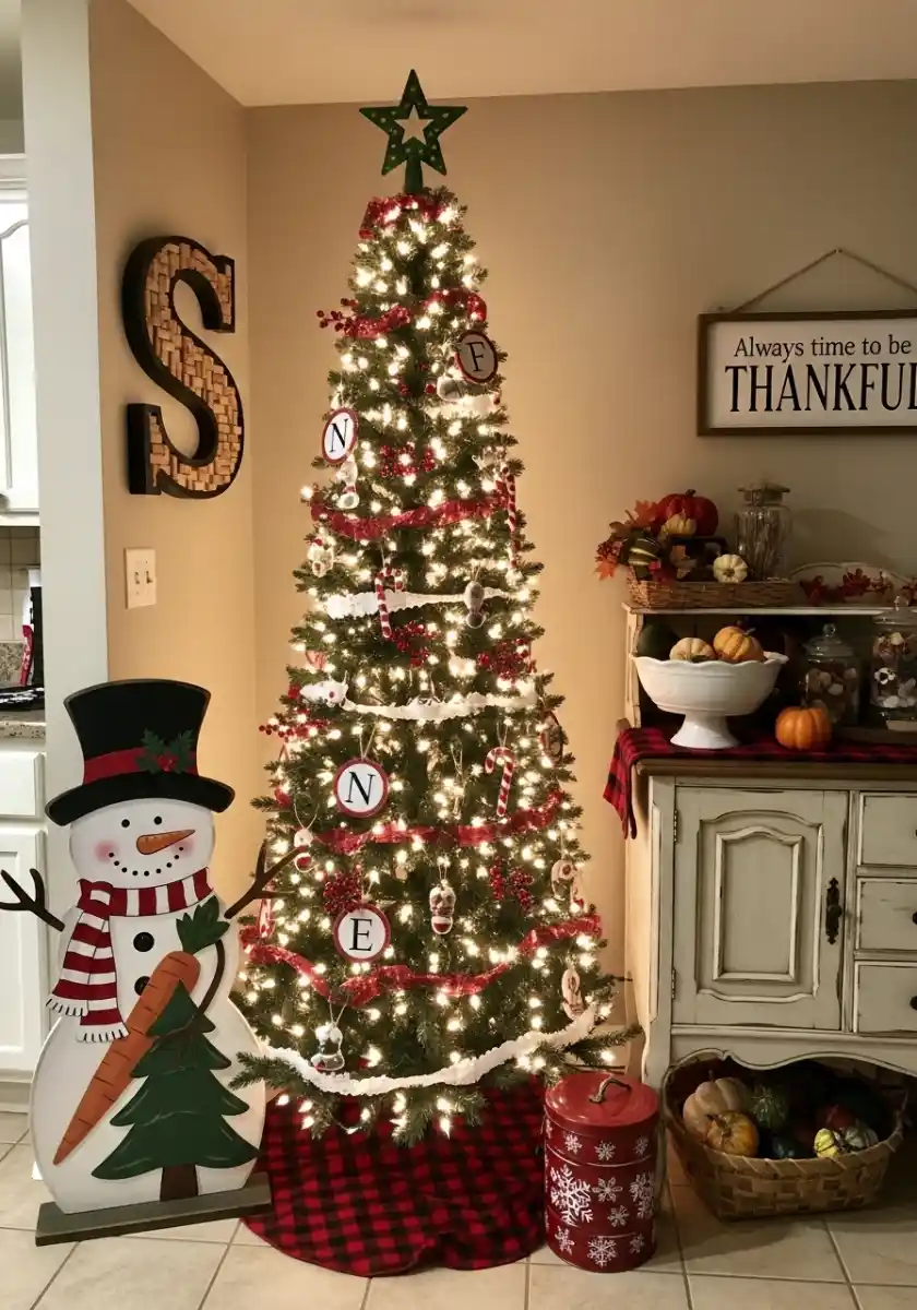 I like to personalize this farmhouse kitchen tree with monogram ornaments. The trick is spacing. Put letters at eye level and spread them like a triangle so the tree doesn’t feel top heavy. A plaid ribbon ties everything together. If your space has beige walls or warm wood, stick to creamy whites and deep reds. It keeps the palette relaxed and cozy.