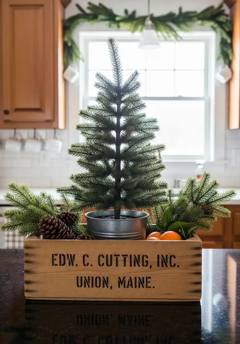 For small kitchens or busy counters, a tiny kitchen Christmas tree in a wooden crate is perfect. I tucked faux greenery, pinecones, and a few clementines around the base, then set the whole thing near the window. It smells like winter, even if the tree is faux. Also, the crate makes cleanup easy. Just pick up and move.