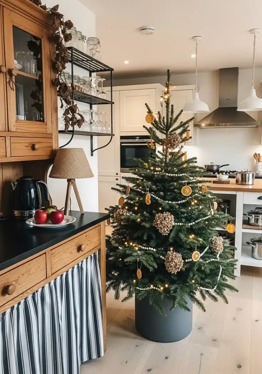Keep them several feet away, water daily, and skip long ribbon tails. A faux kitchen Christmas tree is easier near heat.