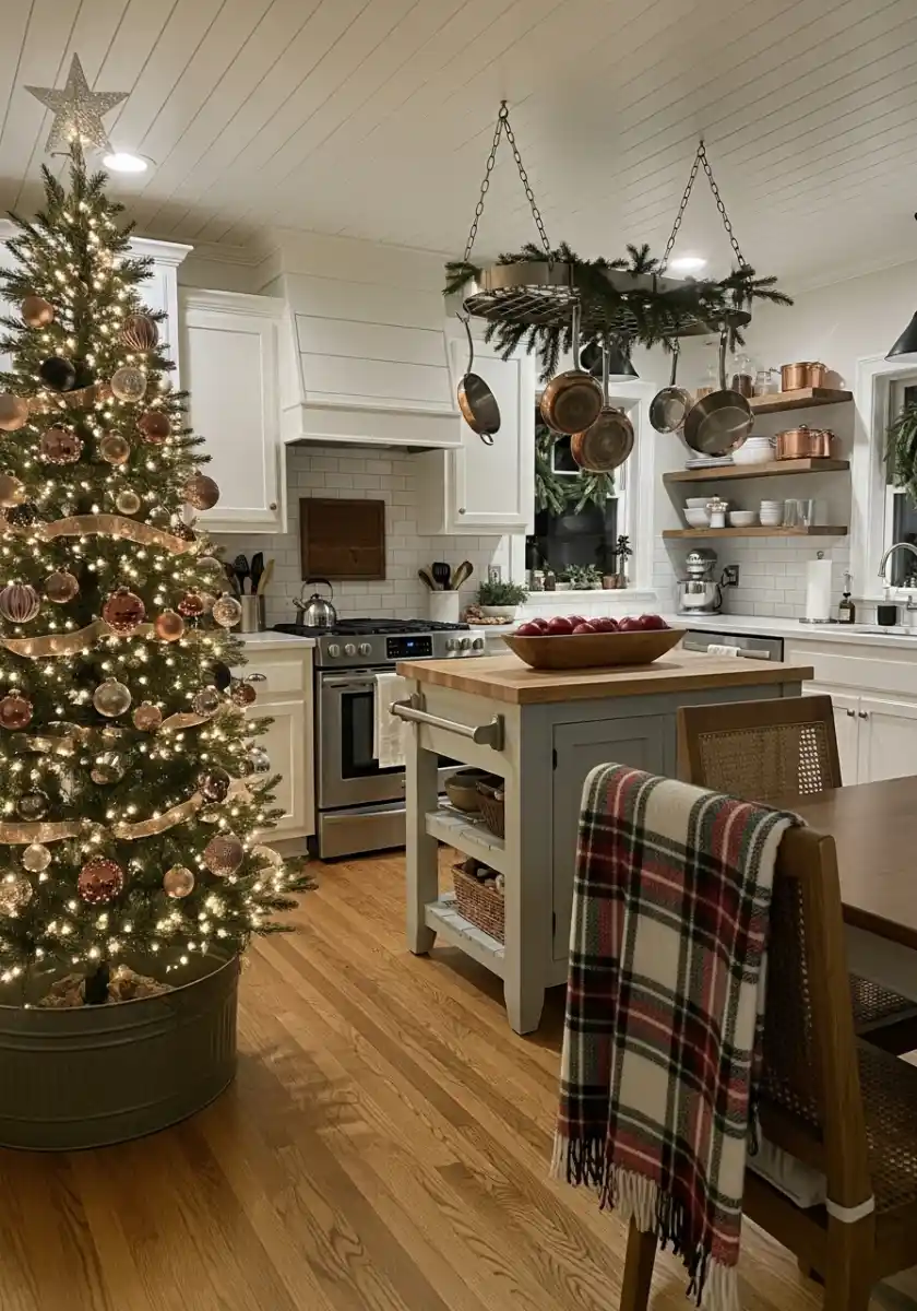 I’m obsessed with the big evergreen tucked into a galvanized tub beside the island. The soft warm lights, rose gold ornaments, and ribbon feel calm, not shouty. I’d keep the lights on a dimmer and stick to one metallic so it doesn’t fight the copper pots. The pot rack swagged with simple greens is smart too. It frames the work zone without dropping needles into dinner.