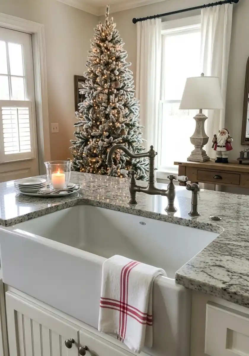This frosted beauty stands near the window and the apron-front sink, and it makes the whole corner glow. The flocking pairs with the white drapes and marble-look counters, so the whole palette stays soft. I’d run warm micro LEDs and add matte silver or wood ornaments to keep the winter vibe. That tiny Santa, the neutral lamp, and one candle feel collected, not staged.