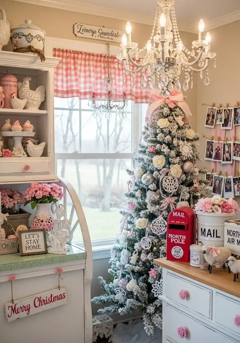 Pastel people, this one is for us. A frosted kitchen Christmas tree covered in lace snowflakes, pink roses, and pearl garland looks like a cupcake tower. Crystal chandeliers sparkle above, and a pink gingham valance softens the light. Everything whispers, not shouts, but it still feels magically festive.