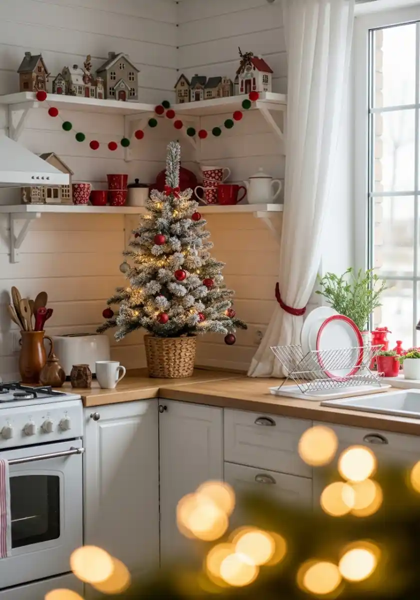 A little L-shaped kitchen proves a christmas tree in kitchen doesn’t need floor space. The tree sits in a woven basket on the counter beneath open shelves filled with a small ceramic village. A felt ball garland runs edge to edge. I was skeptical at first, worried about clutter, but it reads tidy because the colors are controlled.