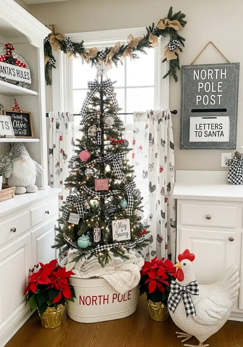 I giggled when I saw this one. A slim tree sits inside a white tub labeled “North Pole,” with black-and-white check bows and two poinsettias at its feet. A galvanized “Letters to Santa” sign hangs nearby, and a giant sparkly chicken with a matching bow stands guard. It’s quirky, and that’s the joy.