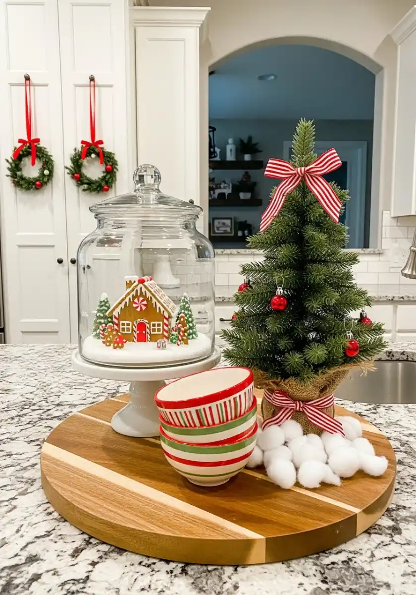 If you love baking, this setup is basically a dessert cart parked on the counter. A glass cloche covers a tiny gingerbread house staged on sugar “snow,” while a small kitchen Christmas tree with a striped bow keeps the color story moving. Bowls stacked like peppermint candies invite cocoa time. Everything sits on a round board, so cleanup is one lift.