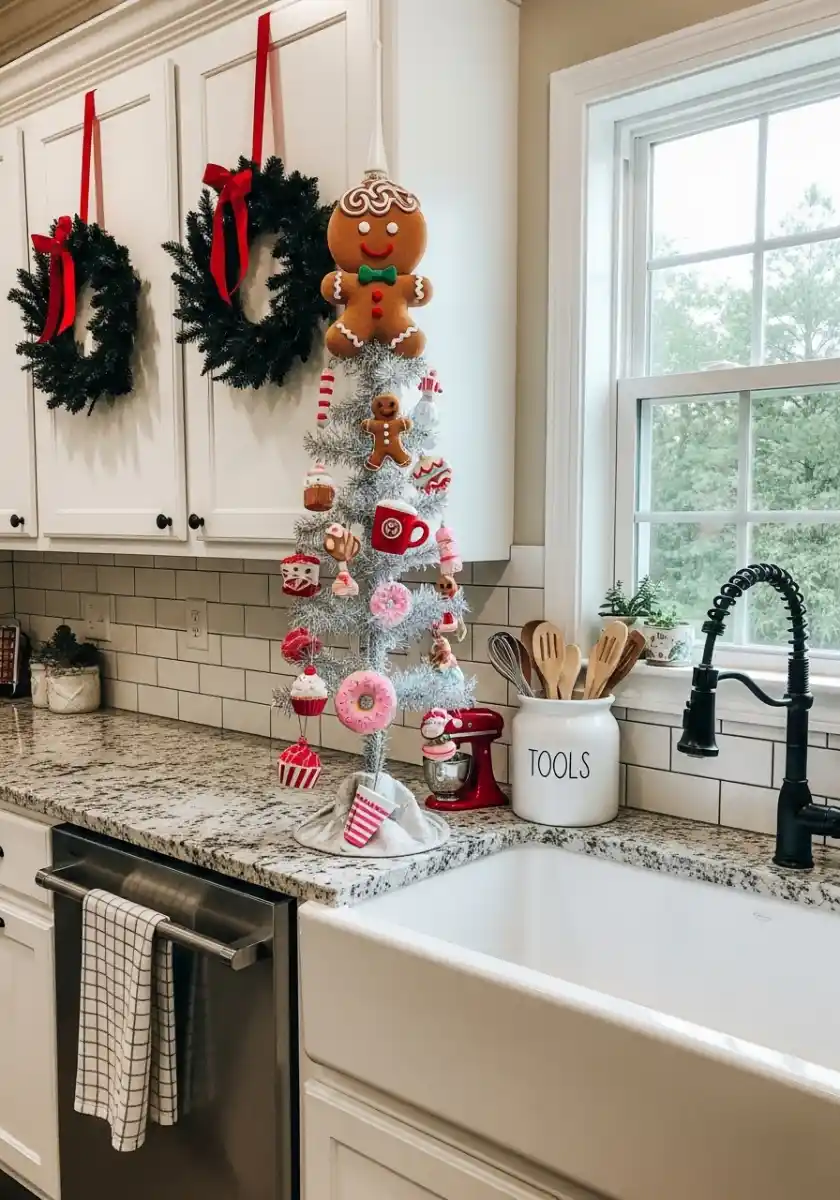Here’s where the kid in all of us wins. A slim white tree near the sink is covered with plush donuts, coffee cups, and cupcakes, topped by a big smiling gingerbread man. Cabinet wreaths hang from red ribbons nearby. The look is playful, and the christmas tree in kitchen makes washing dishes less boring.